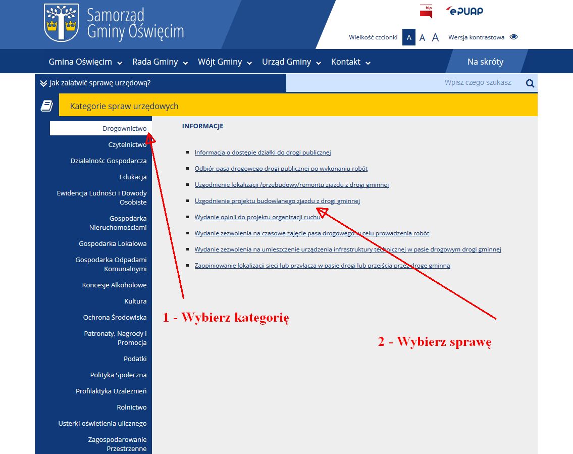 Na każdej stronie Gminy Oświęcim, jednostek podległych znajdujących się na portalu gminy Oświęcim, znajduje się link Jak załatwić sprawę urzędową? - umieszczony zawsze w tym samym miejscu, gdzie znajdziemy informację dot. sposobu załtawienia spraw urzędowych.