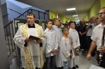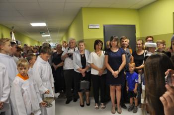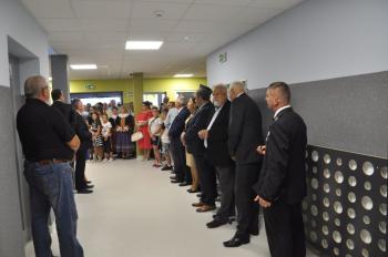 Część oficjalną kontynuowano już we wnętrzu szkoły – proboszcz porębskiej parafii poświęcił budynek, a następnie zgromadzeni goście zebrali się w nowej sali gimnastycznej, by wysłuchać podziękowań i przemówień z okazji otwarcia szkoły.