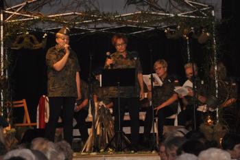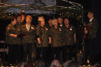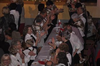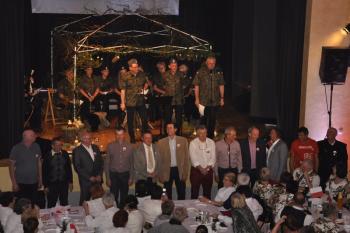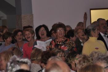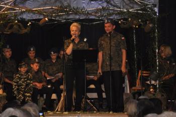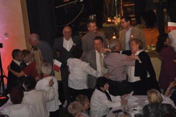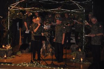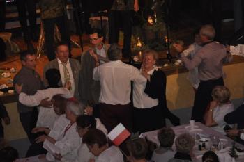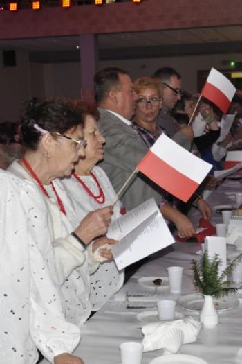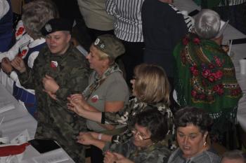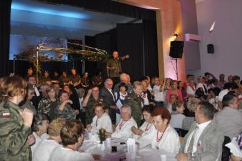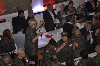 Gospodarz wieczoru, dyrygent chóru "Canticum Canticorum" Piotr Ciuła poprosił zebranych o powstanie do wspólnego odśpiewania "Marsza Pierwszej Brygady", przypominając, że od jedenastu lat jest to pieśń reprezentacyjna Wojska Polskiego. Po niej popłynęły kolejne żołnierskie melodie: "Przybyli ułani pod okienko", "Wojenko, wojenko", "O mój rozmarynie". Biesiadnicy wzbogacali wokalne popisy bujaniem, huśtaniem i kołysaniem, a nawet spontanicznym dyrygowaniem, które tylko czasem rozmijało się z rytmem wykonywanych utworów. Dominowały narodowe rekwizyty: chorągiewki, kotyliony, szaliki i obowiązkowe biało-czerwone plakietki.
