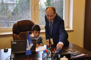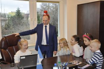 Chwilę później przedszkolacy opanowali najważniejszy gabinet w Urzędzie. Sprawdzili, jak się siedzi w fotelu wójta, ale ogromne – z ich perspektywy – biurko nieco ich onieśmieliło. Nie zapomnieli jednak, że przyszli załatwić najważniejsze sprawy. Złożyli szczególny dokument: zarazem wniosek i zarządzenie, żeby wszystkie dzieci były szczęśliwe. Sześcioletni Krystian potwierdził przedłożone pismo własnoręcznie narysowanym samochodem.