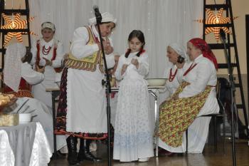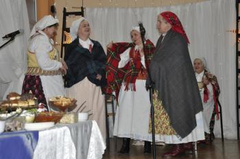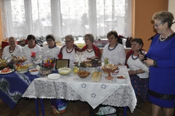 Zanim jednak wszyscy oddali się degustacji na zakończenie zobaczyli przedstawienie. Zespół Pieśni i Tańca "Modraszka" jego tematem uczynił darcie pierza. Była to żmudna i czasochłonna praca, która wymagała anielskiej cierpliwości, dlatego kobiety wykonywały ją w zimowe wieczory. Stawała się zarazem okazją do wspólnego spędzania czasu, bo mężatki, panny, dzieci, kumy i sąsiadki umilały sobie czas śpiewem i żartami.
